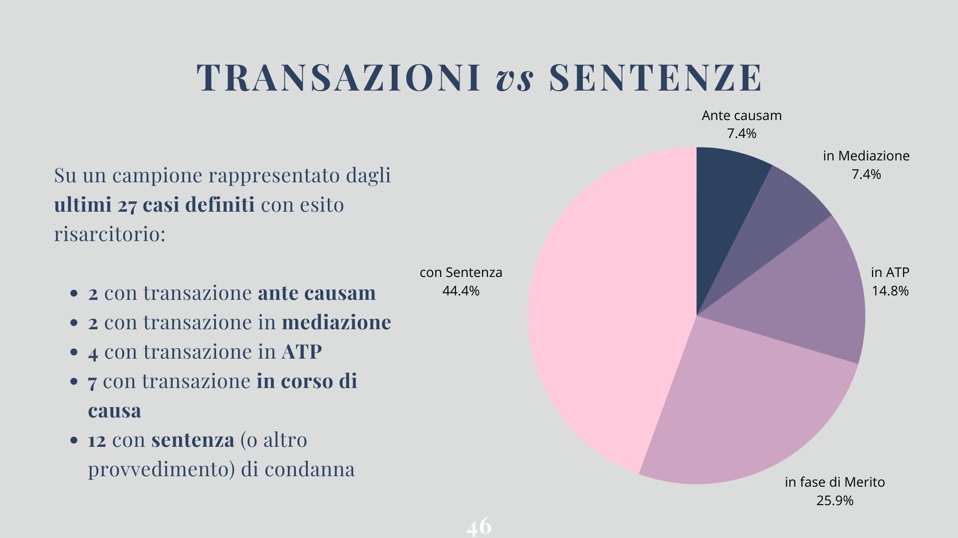 Secondo la nostra esperienza, circa il 26% dei casi di responsabilità sanitaria si chiude con una transazione durante il giudizio di merito, mentre quasi la metà arriva a sentenza.