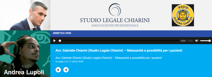 L’Avv. Gabriele Chiarini è stato ospite di Genetica Oggi, trasmissione radiofonica in onda su Radio Cusano di approfondimento scientifico sui temi legati alla medicina, alla salute, e alla ricerca biomedica. Il conduttore, Andrea Lupoli, lo ha intervistato sulle questioni della malasanità e dei diritti del paziente. Ecco la trascrizione dell’intervista.
