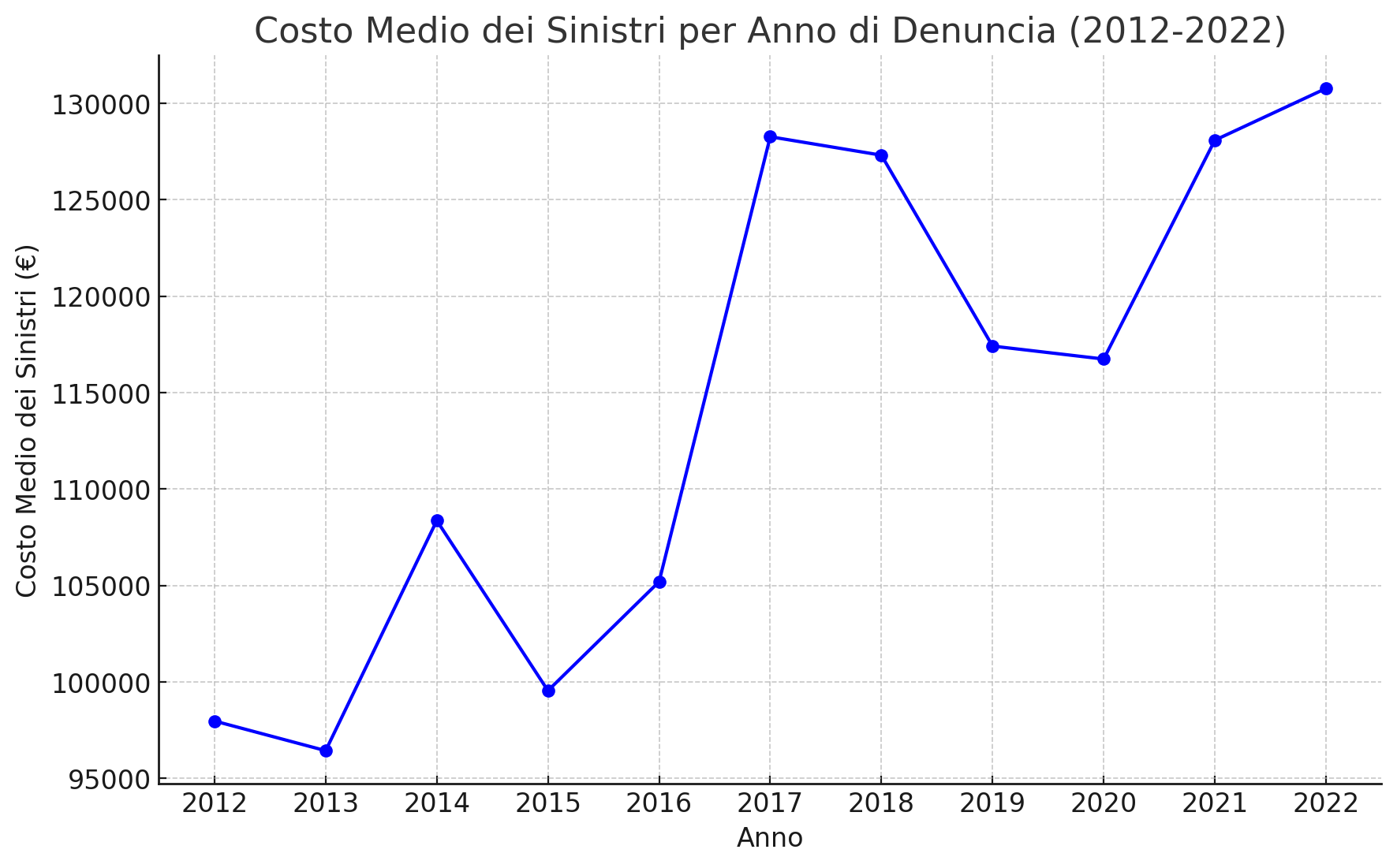 Nonostante il calo nel numero di sinistri, il report mette in evidenza un trend opposto per quanto riguarda i costi di risarcimento. Il costo medio dei sinistri è cresciuto sostanzialmente: da 98.000 euro nel 2012 a 130.000 euro nel 2022.