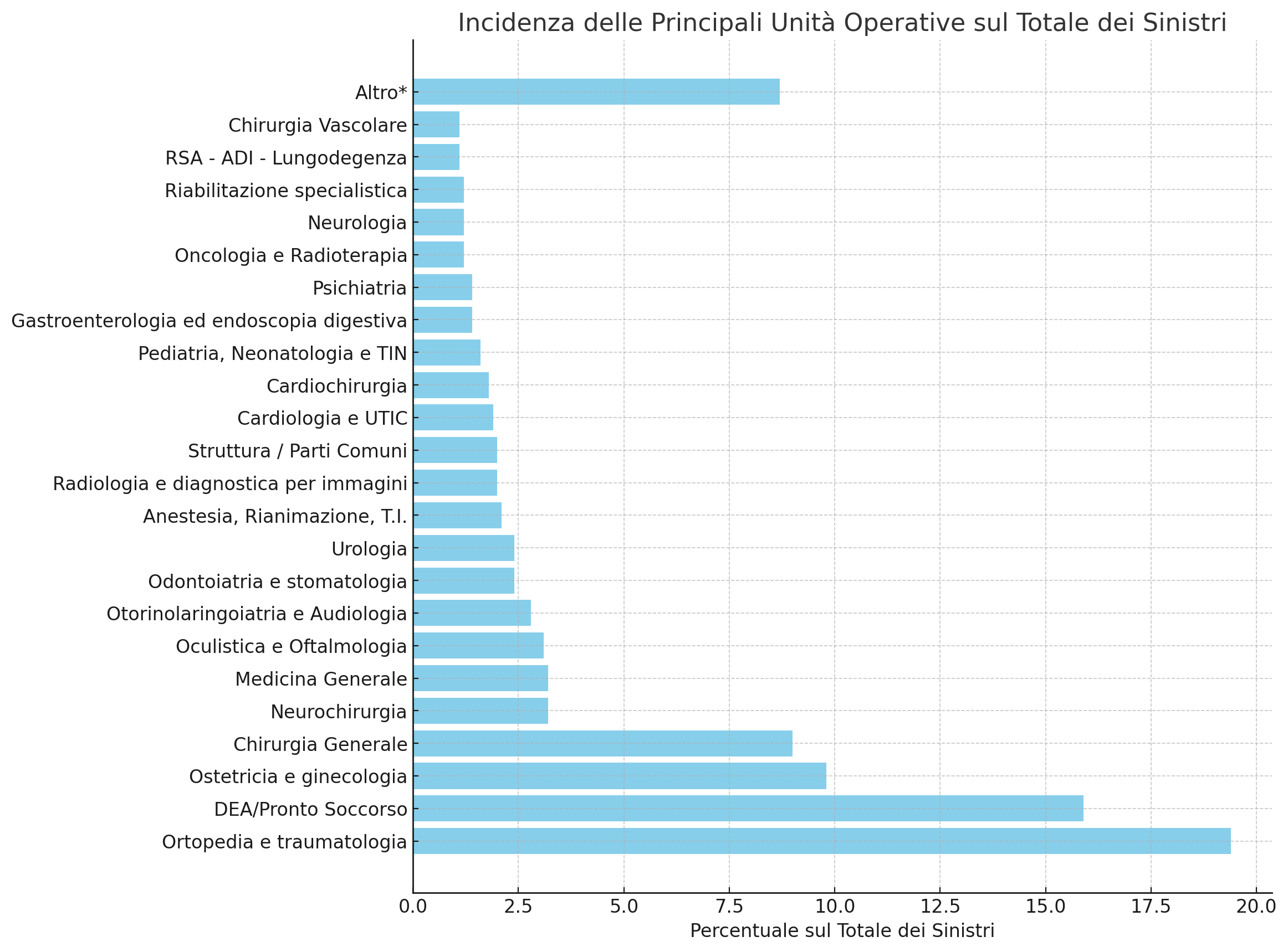 Il report analizza anche la distribuzione percentuale dei sinistri nelle diverse specialità mediche. L’Unità Operativa di Ortopedia e Traumatologia emerge come principale fonte di rischio, con il 19,4% dei sinistri. Seguono le aree di DEA/Pronto Soccorso e Ostetricia e Ginecologia, rispettivamente con il 16% e quasi il 10% delle richieste.