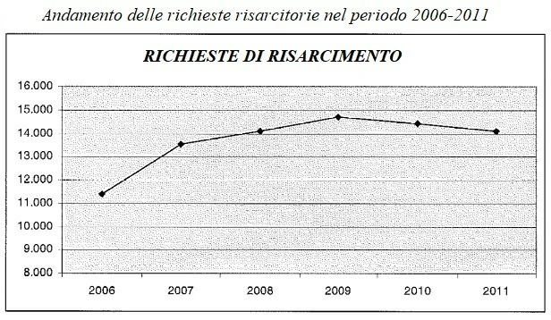 Benché si tratti di dati non recentissimi, è opportuno menzionare – attesa la fonte istituzionale da cui proviene – anche la relazione conclusiva approvata (il 22/01/2013) dalla Commissione Parlamentare di inchiesta sugli errori in campo sanitario. Essa ha confermato che, negli anni dal 2006 al 2011, alle aziende sanitarie coinvolte nelle rilevazioni statistiche (169), sono state indirizzate complessivamente 82.210 denunce di episodi avversi e conseguenti richieste di risarcimento, per una media 13.702 richieste annuali.