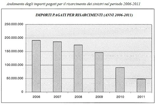 I risarcimenti erogati nel periodo in questione (2006-2011) ammontano complessivamente ad euro 837 milioni, con un andamento – illustrato nel grafico che segue – che dimostra una costante riduzione degli importi pagati (dai 191 milioni del 2006, ai meno di 50 milioni del 2011).