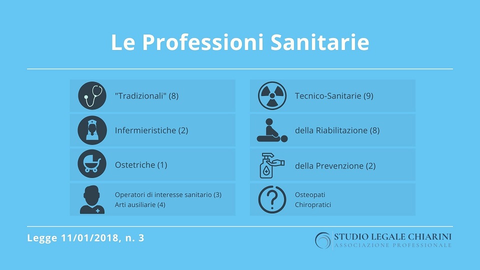 - legge 11/01/2018, n. 3 (“Delega al Governo in materia di sperimentazione clinica di medicinali nonché disposizioni per il riordino delle professioni sanitarie e per la dirigenza sanitaria del Ministero della salute“).