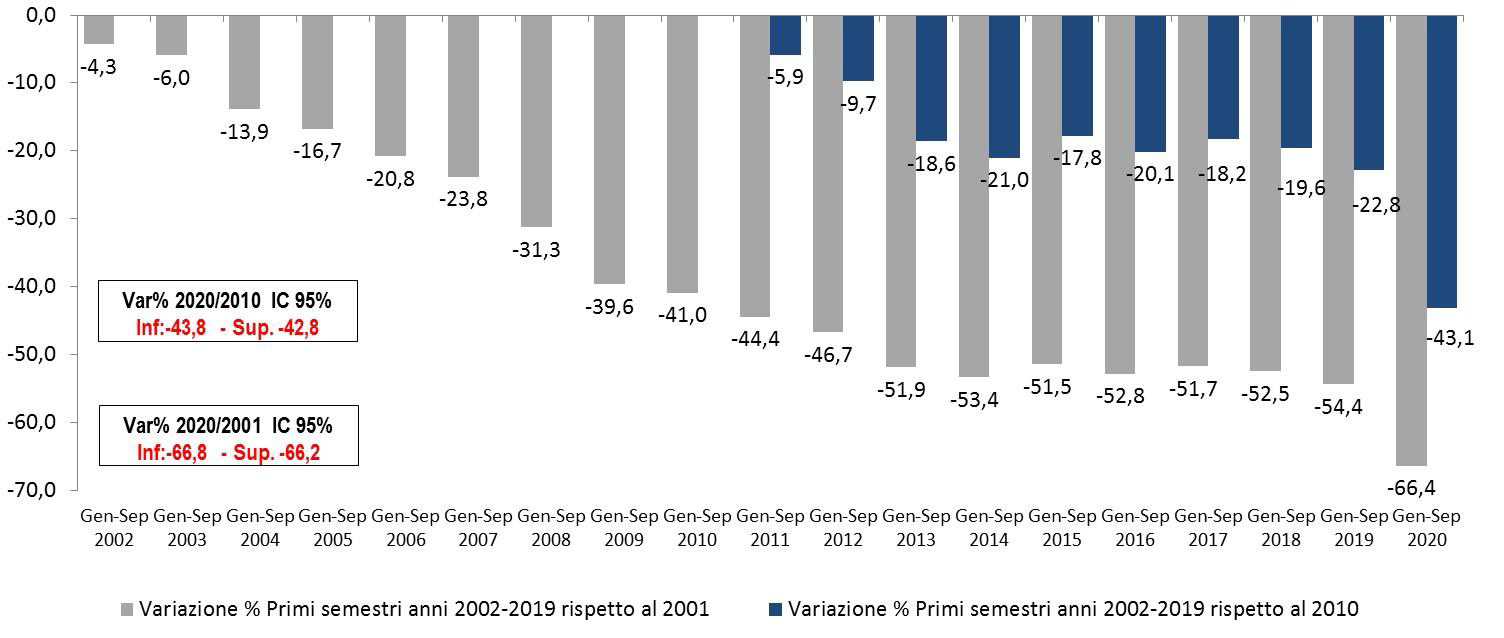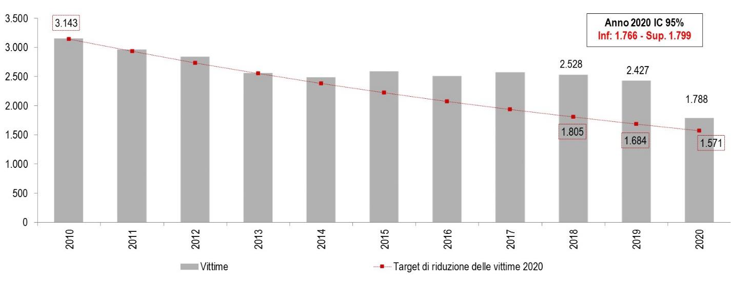Nel grafico che segue, possiamo osservare il numero di vittime negli incidenti stradali registrato dall’Istat nei periodi gennaio-settembre dal 2010 al 2020 secondo una stima preliminare.