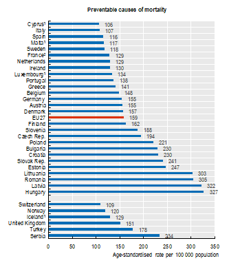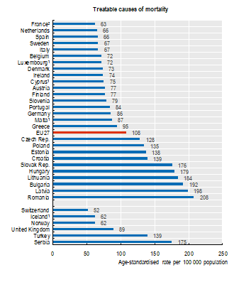 Il parametro italiano di mortalità evitabile (nella duplice accezione di mortalità prevenibile e trattabile), a dire il vero, è piuttosto incoraggiante. L’italia mostra infatti un indice di mortalità prevenibile pari a 107 su 100.000 abitanti, e di mortalità trattabile pari a 67/100.000, facendo decisamente meglio della media E.U. (159 e 108/100.000) e posizionandosi così tra gli stati più virtuosi.