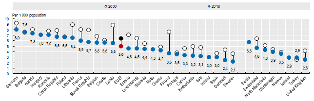 Al pari dell’esigenza di avere un numero sufficiente di medici ed infermieri in servizio, la pandemia di COVID-19 ha evidenziato la necessità di disporre di una quantità adeguata di posti letto ospedalieri, così come l’opportunità di assicurare una certa flessibilità nel loro utilizzo, in modo da poter affrontare un improvviso aumento della domanda di ricoveri (come è purtroppo accaduto, in particolare, nelle unità di terapia intensiva). In proposito, va detto che – tra il 2000 ed il 2018 – la disponibilità di posti letto in ospedale è generalmente diminuita nei paesi dell’E.U., anche in ragione della riduzione della durata media di degenza e della progressiva introduzione di alternative assistenziali “a ciclo diurno”, che non prevedono il ricovero del paziente.