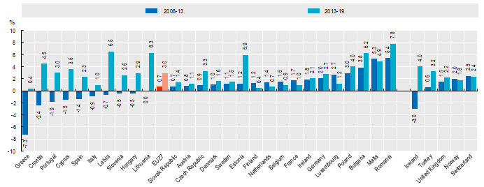 Decisamente interessanti sono i dati sull’andamento della spesa sanitaria nel tempo, dai quali emerge che l’Italia è uno dei pochi paesi in Europa ad aver tagliato la spesa sanitaria nel periodo 2008-2013, per tornare a farla crescere – anche se di poco – soltanto a partire dal 2014. Quasi tutti gli altri stati (con poche eccezioni, tra cui spiccano per l’entità dei tagli Grecia e Islanda) non hanno mai ridotto gli investimenti destinati all’assistenza sanitaria.